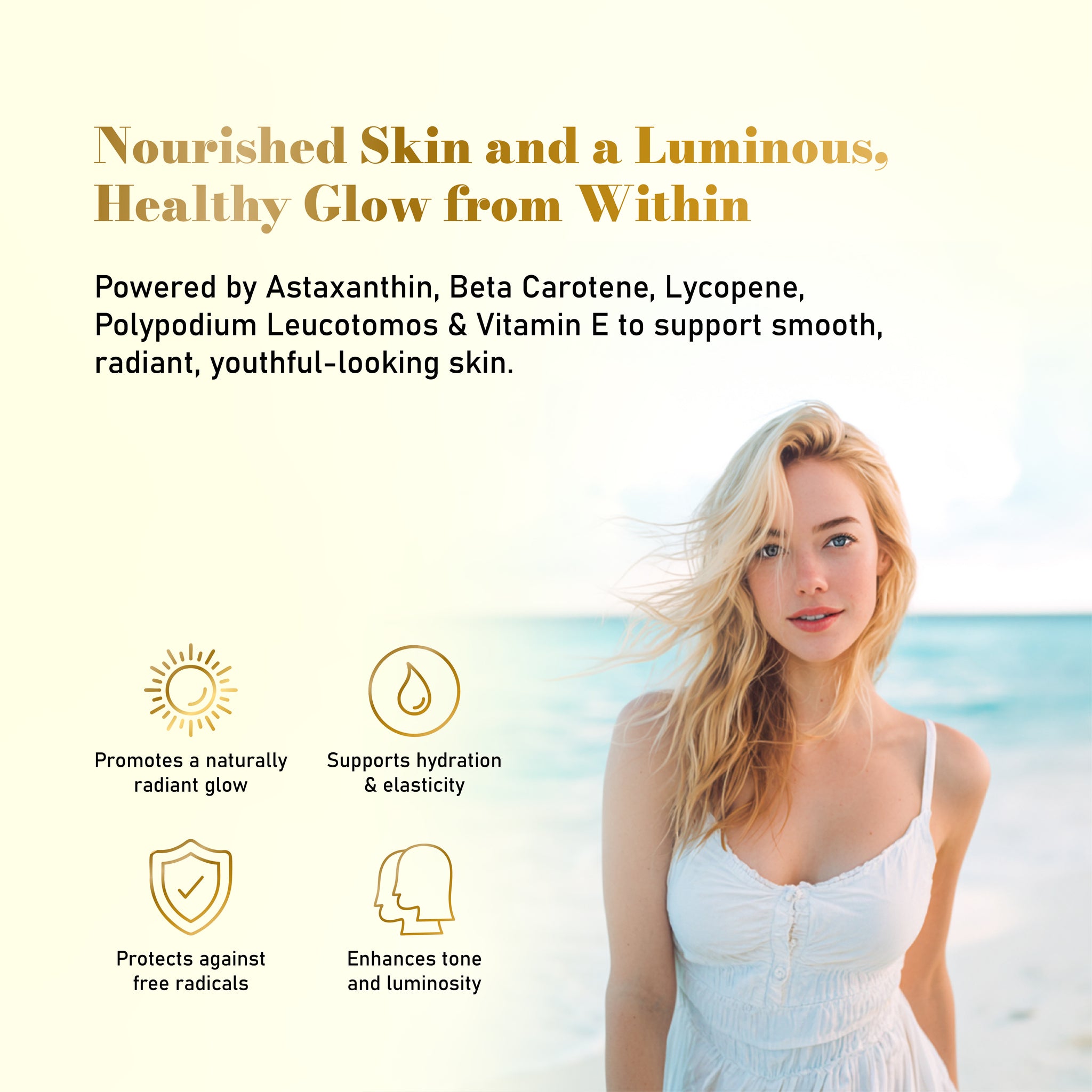 This advanced blend of antioxidants, carotenoids, and skin-nourishing nutrients helps maintain a smooth, luminous, and balanced complexion year-round. Each capsule works from the inside out to support hydration, firmness, and elasticity while defending the skin against oxidative stress and daily environmental exposure
